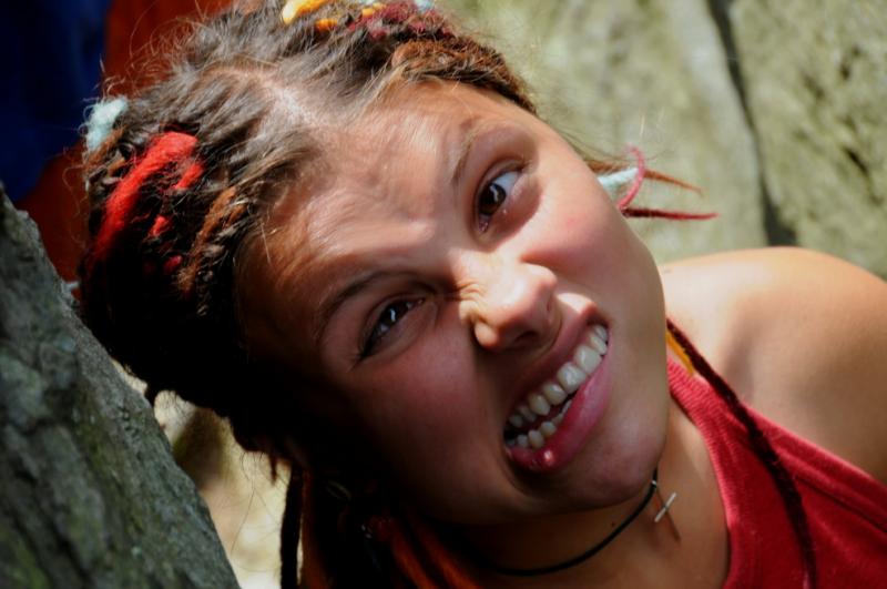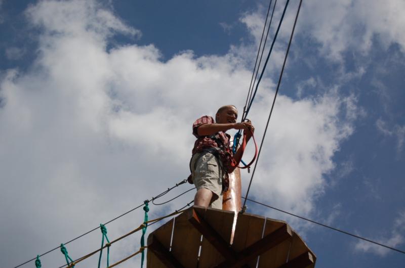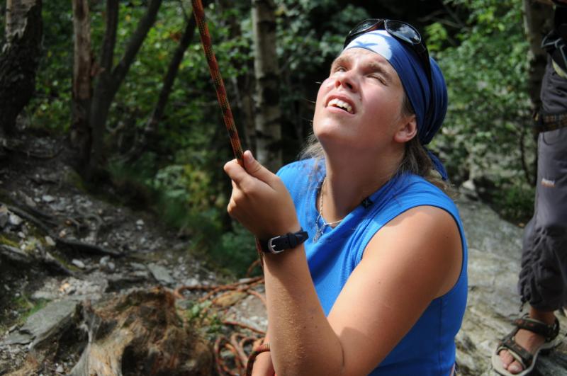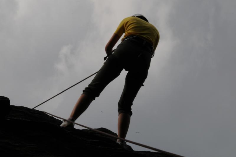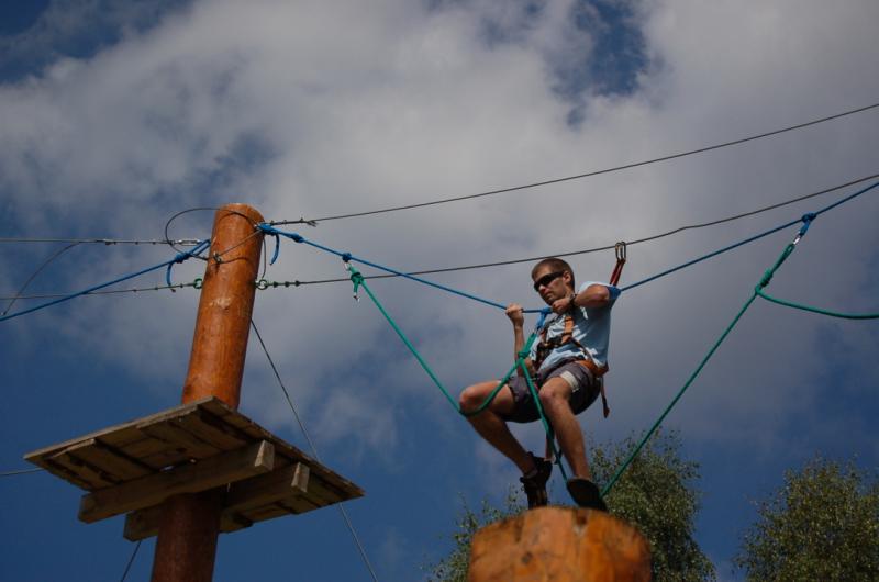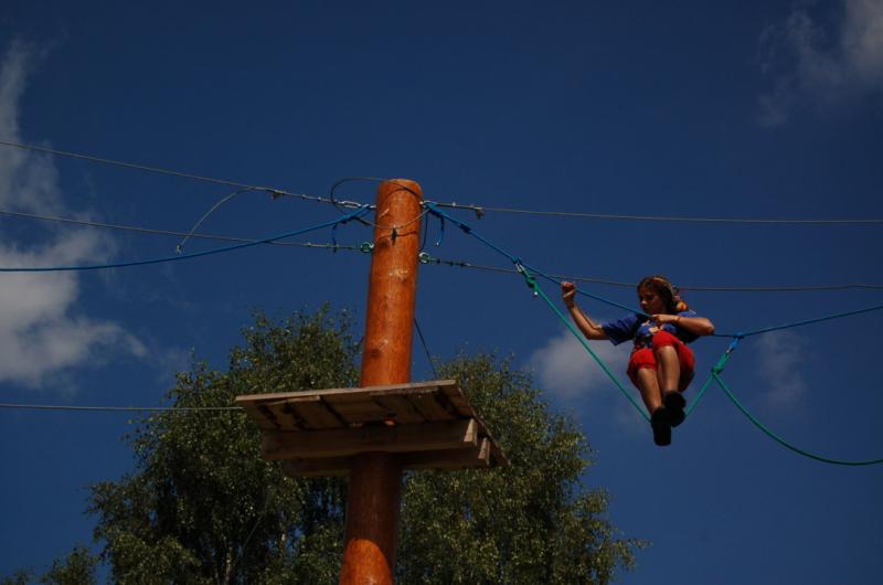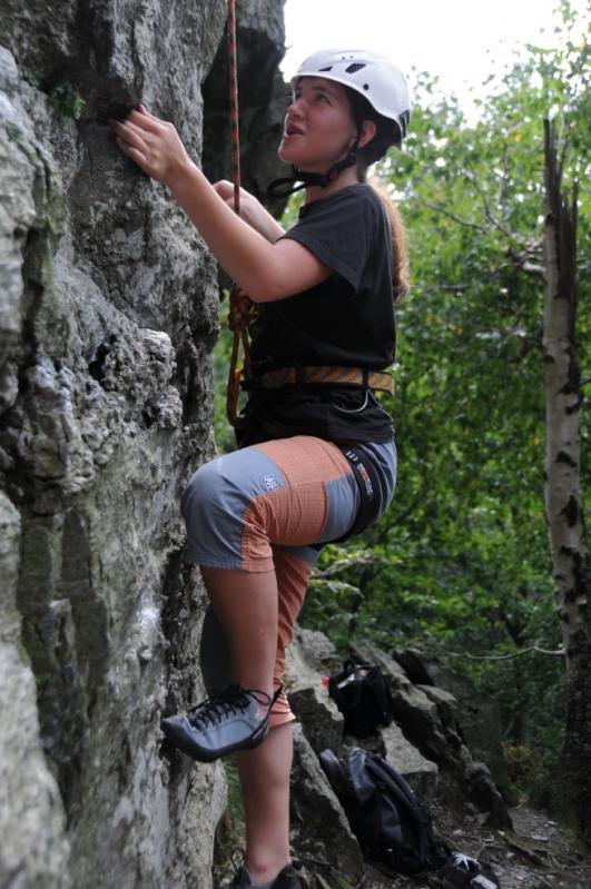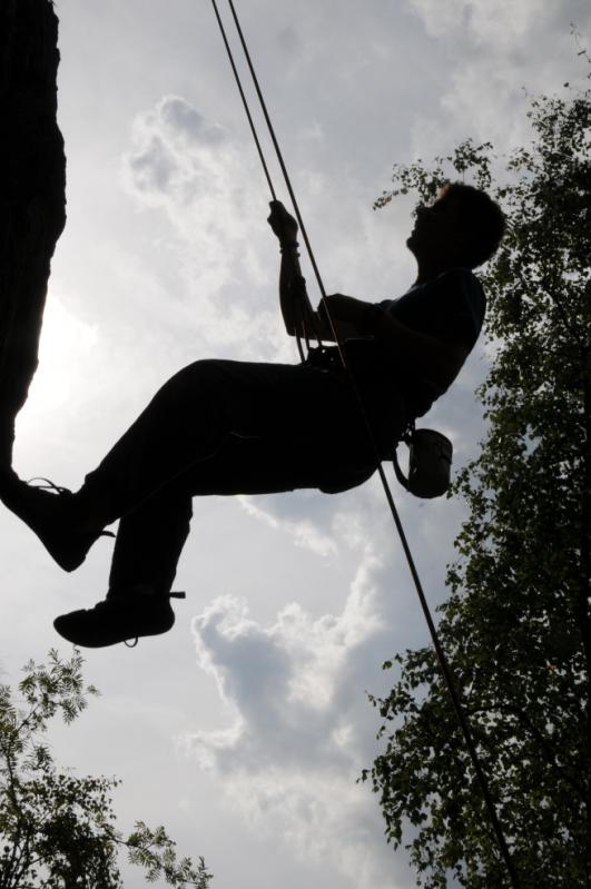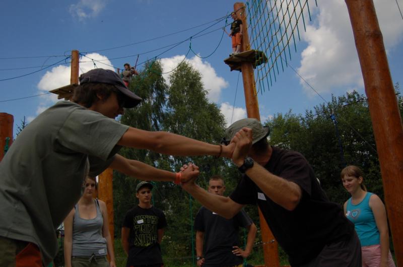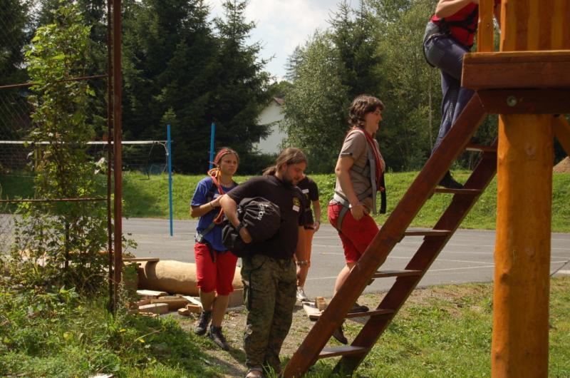 Ráno se rozdělujeme na poloviny, jedna odchází slaňovat pomocí různých věciček- pomocí osmy a kyblíku. Druhá polovina se pokouší uvázat nějaké uzly. Inovace jsou i v tomto odvětví horolezectví vítány, ovšem, je vhodné pokud nový model uzlu má vyšší pevnost nebo lepší vlastnosti než uzel předchozí, což se o našich veledílech doopravdy říct nedá... Po prostřídání ještě testujeme, jak bychom zvládli různé týmovky. Až na to, že by jedna skupina vyhodila pomocí bomby (voda v kýblu) nejbližší okolí do povětří, tak nám to i celkem šlo. Po obědě se opět dělíme na poloviny, jedna míří pod stěnu, druhá k trampolíně. Na trampolíně všichni předvádí psí kusy, dokud se jim nezačne oběd v žaludku převracet v rytmu jejich výskoků. To na stěně zase všichni, kdo stojí dole, radí a radí, ale jakmile přijde jejich okamžik a oni zoufale visí na laně a bezmocně rozhazují ručkama, to už mlčí :-) Po střídačce následují další týmové hry, kdy se poslepu snažíme najít tenisák, projít střediskem a trefit dojít k terči na lukostřelbu. Inu, ne vždy platí heslo "risk je zisk" a po několika minutách bloudění po středisku, kdy co chvíli zakopáváte o kameny, palisádu, o nohy toho, kdo jde před vámi, už jste doopravdy vděční, když narazíte do něčeho a můžete s čistým svědomím říct, že jste ještě nikdy neměli z nárazu větší radost, než když jste narazili do toho terče.