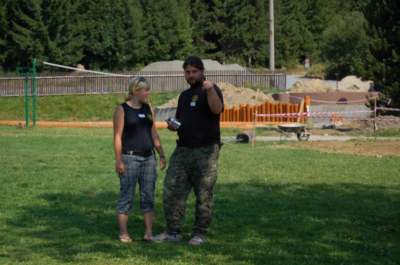 Druhá hra byla podobně vypečená: tady je dřevěné "áčko", tady lana, tady začátek a tam konec, přemístěte jednoho člověka taháním za lana k cíli, máte na to dvacet minut, no, tak jsme šli na to a po kdejakých útrapách a pádech je i přemístili. Přednášky, videa, rozborky zbraní, střílení z airsoftky, další přednášky.... Lezlo to do nás horem, spodem, ale přece jen lezlo. Součástky zbraní létaly vzduchem-ona asi jen má nějaký smysl, že se pružinka před vytažením kolíku přidrží, no, alespoň už víme, že při střelbě z paintballky nejsou kuličky úplnou nezbytností... A ani nemrkneme a je něco kolem jedenácté, proto si balíme své poznámkové bloky a odcházíme spát, aby se nám hlavičky počtem nabytých informací náhodou nezdvojnásobily. Kdo ze spaní nevázal protisměrný osmičkový uzel, anebo nerozebíral zbraň, jako by dneska vůbec nebyl....
