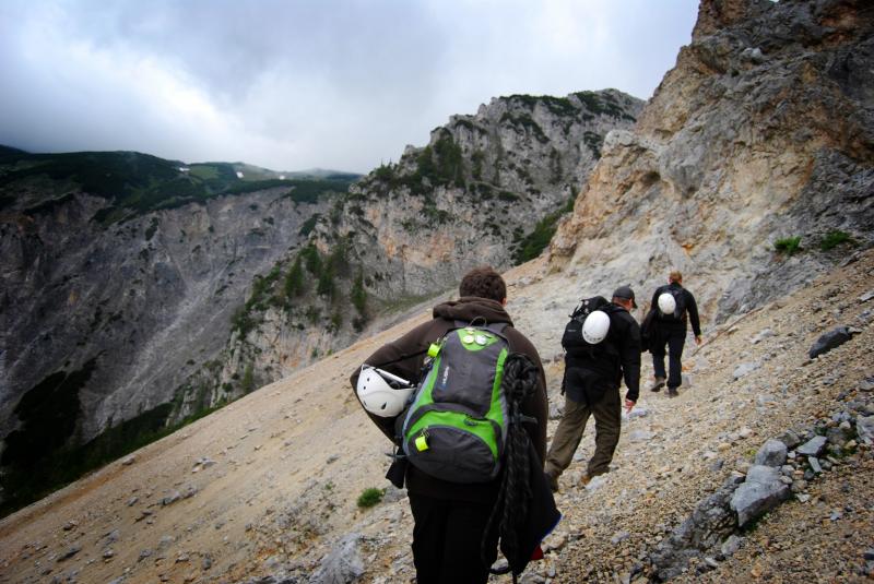 Na liduprázdném parkovišti jsme se najedli, přebalili věci, mokré spacáky nacpali o odpadkového pytle a zabouchli v autě, kolem 8:30 jsme za mrholení vyrazili vzhůru po pěšině křižující silnici. Od parkoviště u Griesleitenhofu (843 m.n.m.) nám trvalo asi hodinu a třičtvrtě než jsme došli pod nástup ferraty Hans von Haidsteig (C/D), zde již nemrholilo, ovšem o to větší vítr foukal :-) Navlékli jsme se do úvazků, přileb, nachystali ferraty a vzhůru! Skály již byly ofoukané a převážně tedy suché, na některých místech je asi mokro celoročně, a tedy i dnes. Stoupáme a fearrata končí..., co to? To byla jen příprava na "žebřík do kurníku" (stromovitý žebřík), který nás hned poté uvítal, pak jsme se želez (mnohdy ohnutých kramlí) a mokrých ploten nezbavili až ke krásně úzkému a klouzavému komínku, kde jsme batůžky drhli a báli se (zvláště tedy ženská část výpravy), aby se nám zadnice v tomto úzkém průchodu nezasekly a my tam nezůstaly trčet :-) Dolezli jsme až k černé sošce Madony, kde ukrutně fučelo, a tak jsme po nezajištěné cestě spěchali dále, do závětří.