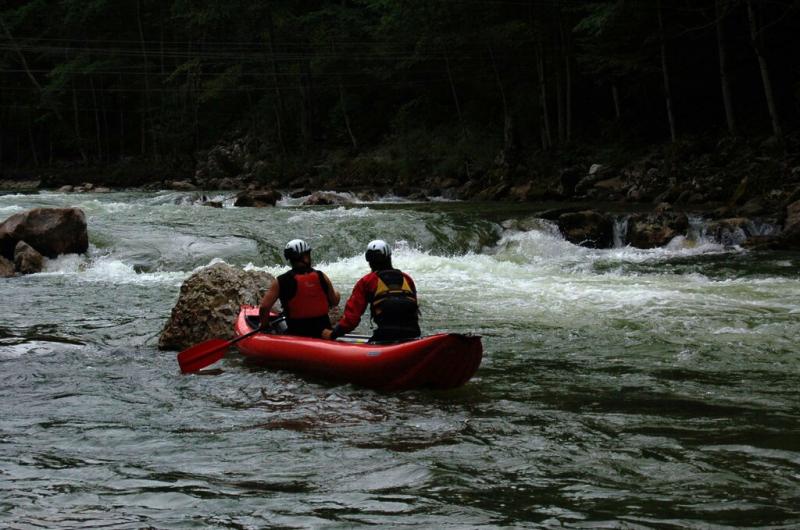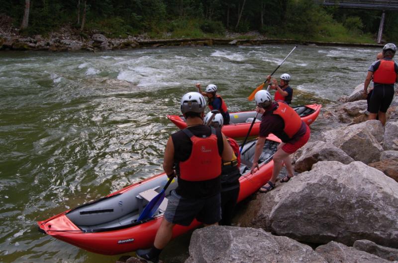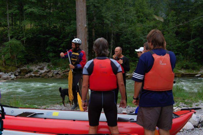 Jakmile máme rozbalen tábor, trochu se zasytíme po dlouhé cestě a začínáme vybalovat naši vodáckou výbavu. Ne nadarmo se Salze říká řeka učitelka a před tím, než se na ni v následujících dnech vydáme, si ji vyzkoušíme přímo v kempu na cvičných peřejích. Nejdříve se ale podrobně seznamujeme s vodáckým vybavením, bezpečnostními pravidly, každá dvojice si pečlivě připravuje loď, helmy, popruhy, vesty atd., přeci jen v lodi strávíme více než pár hodin.