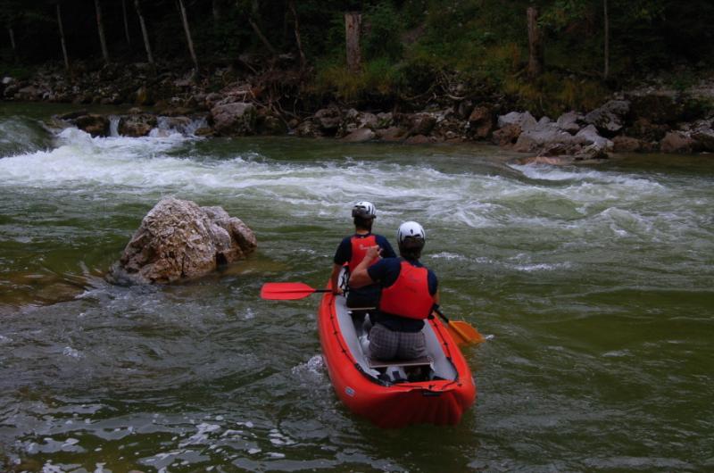 Je úterý, celou noc pršelo, než však vylézáme ze stanů, počasí se trochu umoudřilo. Ale co už, dneska nás čeká voda a jestli budeme o trochu více mokří, to nám už nevadí. Kola necháváme dneska na místě, nakládáme vodácké vybavení a přesunujeme se auty kousek za vesnici Greith. Tam se naloďujeme. Cílovým místem je dnes náš kemp ve Wildalpen. Dnešní úsek není tolik náročný, máme alespoň možnost se pořádně připravit na zítřejší den. Zítřejší úsek je náročnější, dle vodácké terminologie druhý a třetí stupeň. Žádná poklidná plavba to však také není, trasa má přes dvacet kilometrů, občas nás pěkně zchladí průtrž mračen. Do cíle přijíždíme poměrně zmáčeni, nikdo se ale nikde "necvaknul", dobrá příprava na zítřejší den.