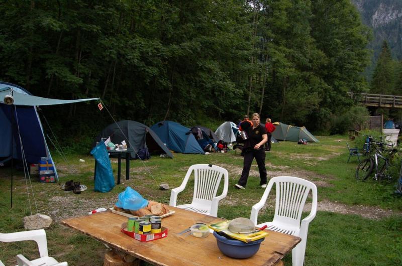 Je neděle, lehce po půl jedenácté dopoledne, jsme v plném počtu, auta a materiál naložena, nasedáme do aut a vyrážím zhruba na pětihodinovou cestu. Našim cílovým místem je kemp u vesničky Wildalpen, který se také stane našim pevným zázemím po celou dobu. Při příjezdu do kempu nás přivítá milý personál, vybíráme místa na stany a začínáme stavět tábor. Místo jsme si vybrali opravdu skvěle, tímto díky předchozím kempařům za super funkční stolek a zároveň pracovní desku a několik židlí :-) Posezení doplňujeme o další přírodní materiál a vytváříme místa k sezení pro celou naši třináctičlennou posádku.