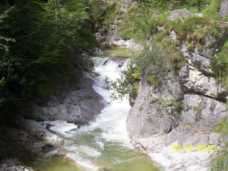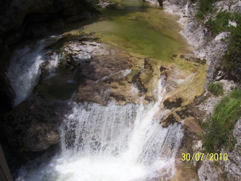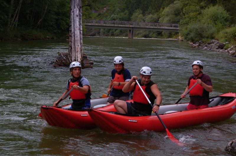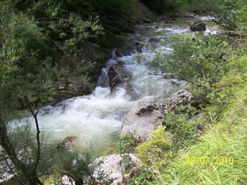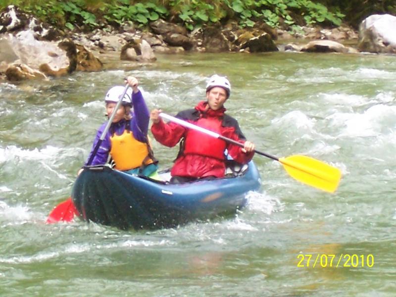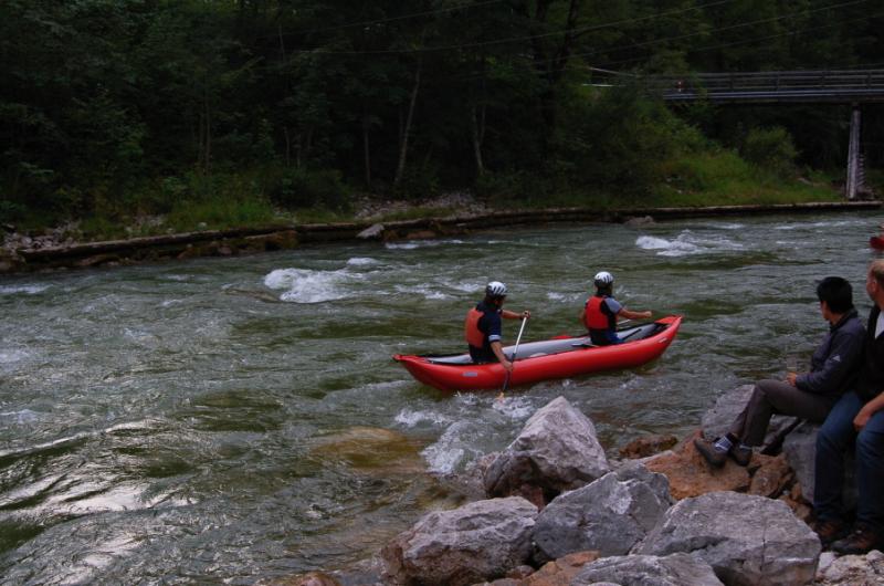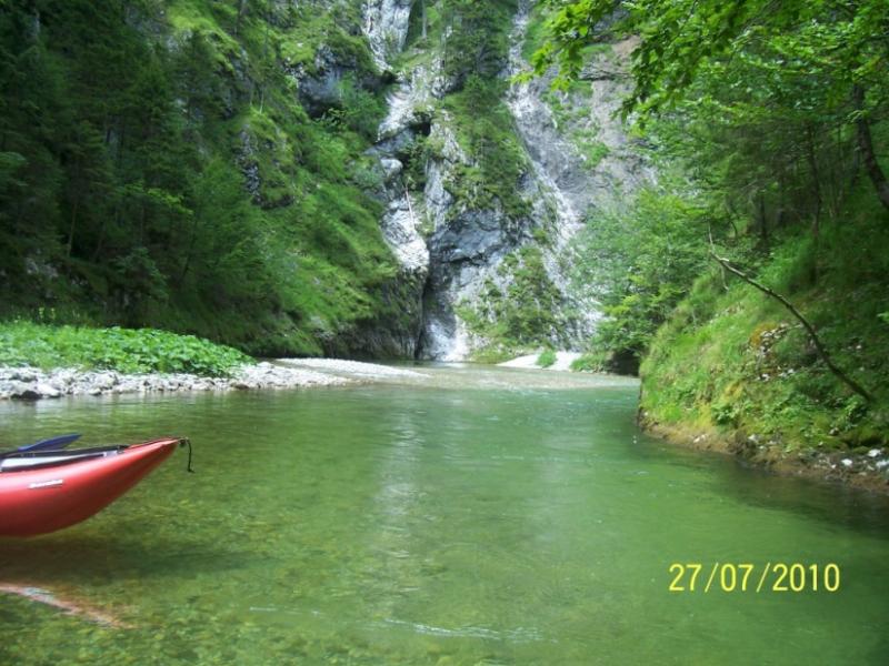 Středa, předposlední den. I kvůli počasí jsme v tento den volili zase vodu. To jsme však ani trochu ráno netušili, že stihneme i kola a jako bonus výšlap k nedalekému vodopádu. Ale vraťme se na začátek. Nalodíme se hned v kempu a po několika málo desítek metrů začíná pěkná jízda. Makat musí oba, háček i zadák, Projíždíme peřejkami, do toho hned pořádné peřeje až si člověk občas říká, kdy už to skončí a je rád za kousek klidné vody :-) Většina z účastníků brzy ráno běží do půjčovny pro neopren, a jak jsou rádi. Téměř každá loď po projetí náročnějších úseků nabírá nějakou tu vodu. Ponaučeni si necháváme mezi posádkami větší rozestupy. To když se jedna "cvakne" o kámen a druhá s úmyslu se vyhnout skončí s otočenou lodí nad hlavami. A přece se někdo " vyklopil" a jak se na to náš vodácký instruktor těšil a nikdo mu nevěřil :-) Mokří, v neoprenu či bez něj, ale také pěkně znaveni, protože sjezd Salzy není procházka růžovým sadem, si užíváme plavbu a kocháme se okolním prostředním. Jsme v cíli, balíme vybavení a nasedáme opět do auta, které nás převáží zpět do kempu. Čas máme dobrý a tak neleníme a přesedáme do sedla kol.