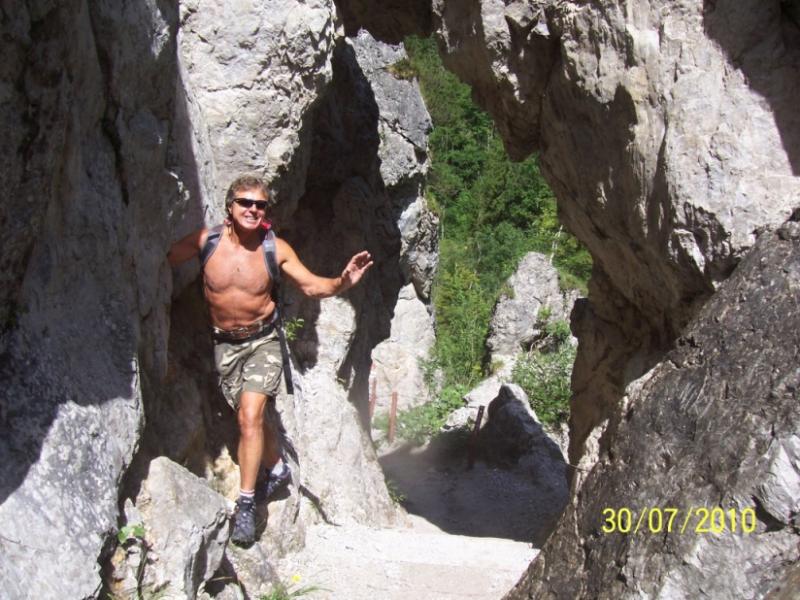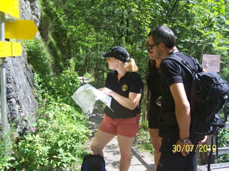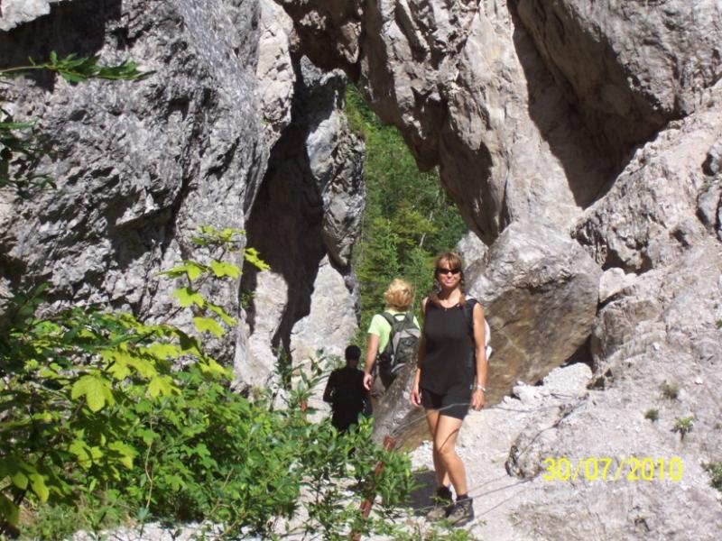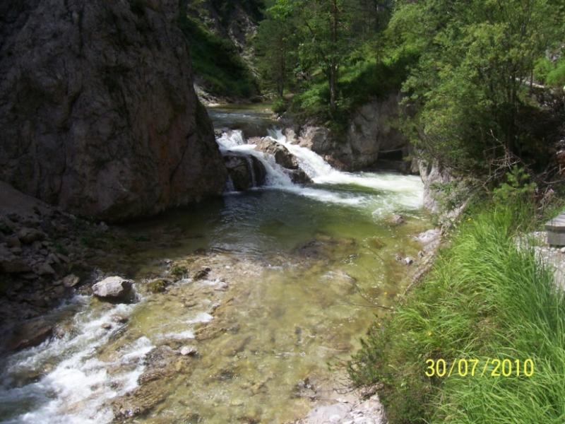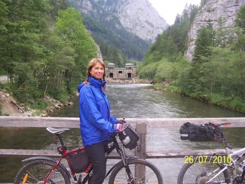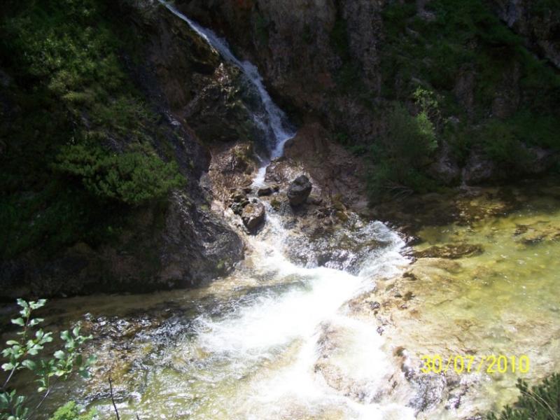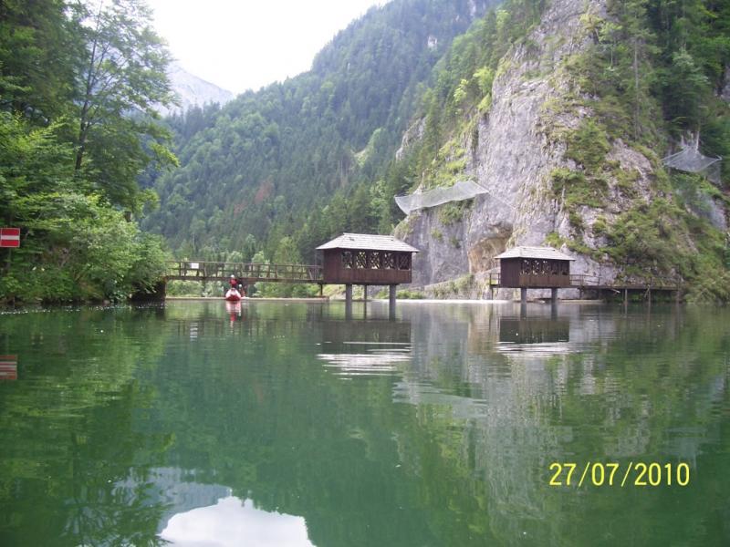 Středa, předposlední den. I kvůli počasí jsme v tento den volili zase vodu. To jsme však ani trochu ráno netušili, že stihneme i kola a jako bonus výšlap k nedalekému vodopádu. Ale vraťme se na začátek. Nalodíme se hned v kempu a po několika málo desítek metrů začíná pěkná jízda. Makat musí oba, háček i zadák, Projíždíme peřejkami, do toho hned pořádné peřeje až si člověk občas říká, kdy už to skončí a je rád za kousek klidné vody :-) Většina z účastníků brzy ráno běží do půjčovny pro neopren, a jak jsou rádi. Téměř každá loď po projetí náročnějších úseků nabírá nějakou tu vodu. Ponaučeni si necháváme mezi posádkami větší rozestupy. To když se jedna "cvakne" o kámen a druhá s úmyslu se vyhnout skončí s otočenou lodí nad hlavami. A přece se někdo " vyklopil" a jak se na to náš vodácký instruktor těšil a nikdo mu nevěřil :-) Mokří, v neoprenu či bez něj, ale také pěkně znaveni, protože sjezd Salzy není procházka růžovým sadem, si užíváme plavbu a kocháme se okolním prostředním. Jsme v cíli, balíme vybavení a nasedáme opět do auta, které nás převáží zpět do kempu. Čas máme dobrý a tak neleníme a přesedáme do sedla kol.