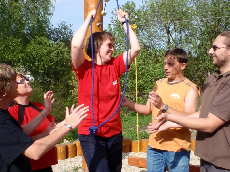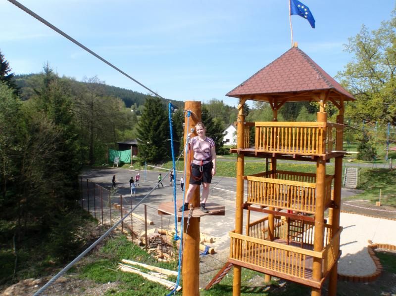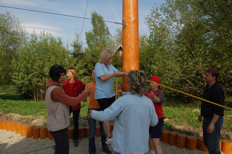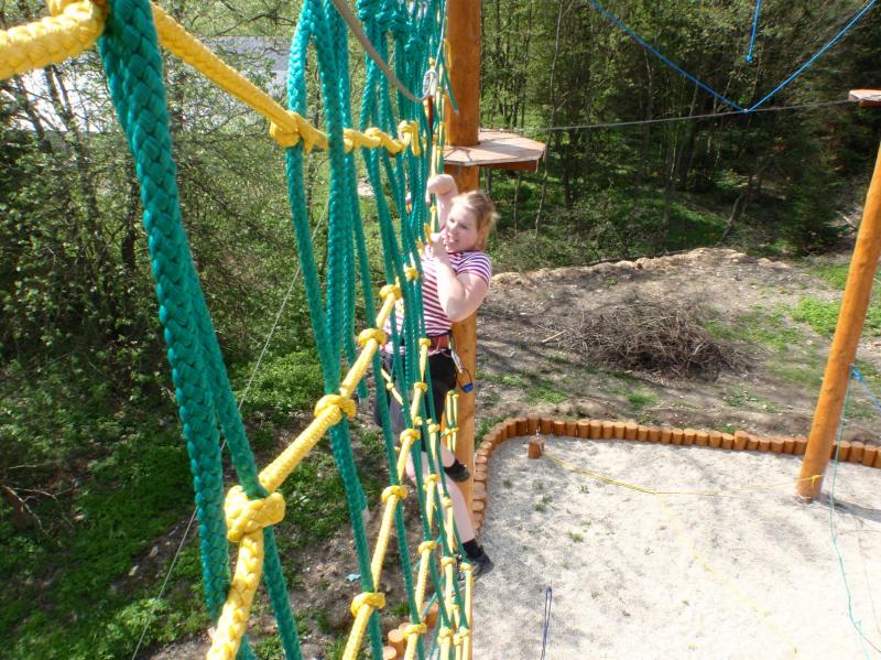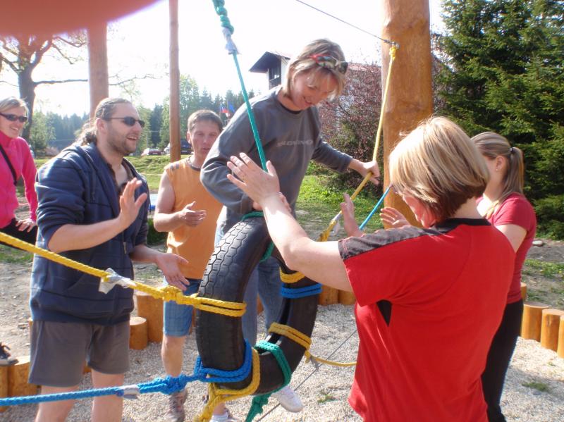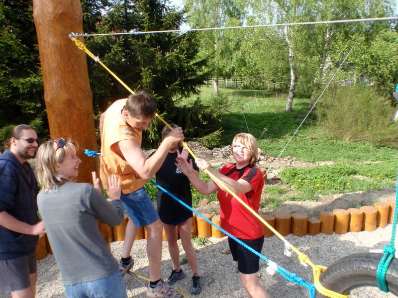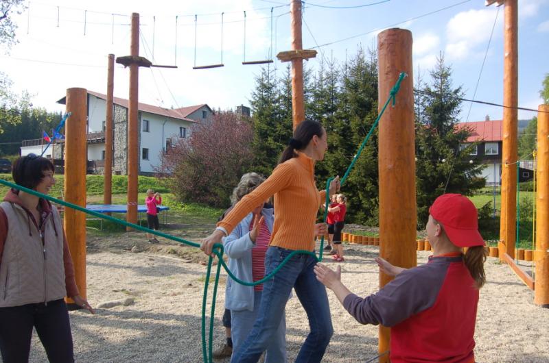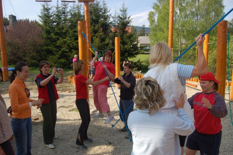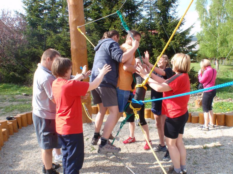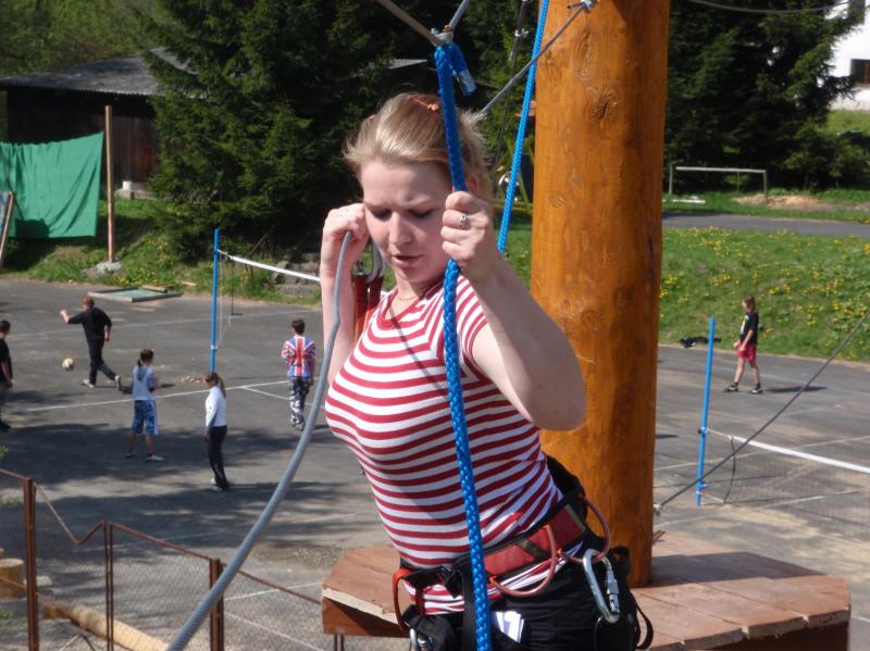 Outdoorové lanové aktivity, které mají vaši žáci možnost si vyzkoušet v našich obou střediscích na školním výletě či sportovní kurzu jsme chtěli dopřát i vám. A došlo na to hned první den. S programem jsme začali sice o něco déle, zato v plném počtu přihlášených účastníků. Pár seznamovaček a týmovek na rozehřátí a šlo se do akce. Začali jsme pozvolna, pouze metr nad zemí a to na nízkolanových aktivitách. Kladina, zauzlované manévry, krocení divokého koně či kočička ( v mužském podání byla lanová překážka přejmenována na divokého kocoura :-)) a spousta dalších. Doplnili jsme síly malým občerstvením a kávou a vyrazili opět do terénu. Přesněji řečeno do vzduchu. První polovina vyrazila na lezeckou stěnu, druhá na vysoká lana. Karabiny drnčely, někomu se v deseti metrech nad zemí klepaly nohy, někomu docházela při uchycení nejvýše usazených chytů na lezecké stěně síla v rukou, ale zvládli jsme to všichni.