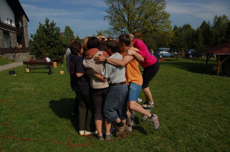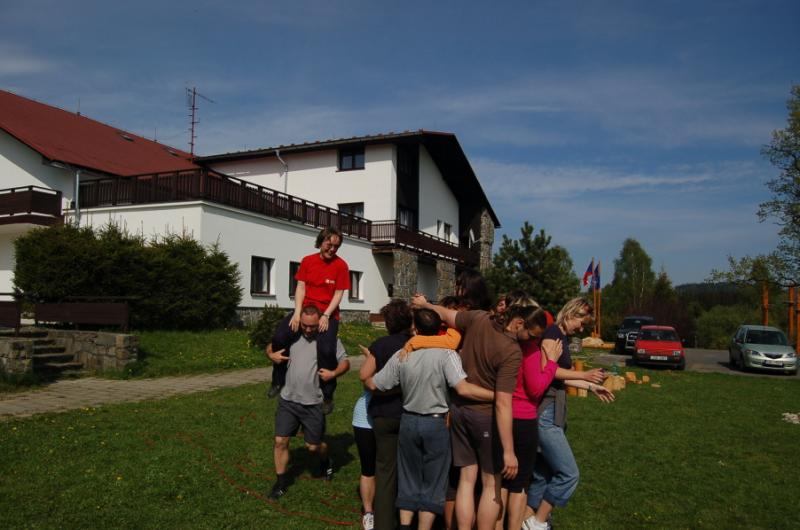 Už jste někdy zkoušeli házet syrové vejce z dvanáctimetrové výšky tak, aby se při dopadu nerozbilo? Ne? Tak to my ano...Každý tým nafasoval do začátku pomocný materiál jako jsou tři špejle, tři papíry a dva balónky. Komu se to zdálo být málo mohl se pokusit získat další materiál na právě vyhlášené burze. Samozřejmě to nebylo zadarmo, ale pokud se vám podařilo splnit zadaný úkol, vyhráli jste materiál. Marná práce to rozhodně nebyla, všechny tři vytvořené mechanismy všech týmů byly spolehlivé a vejce přežila. Sobotní večer ( a nedělní brzké ráno) jsme pak zakončili u rautu, vína a hudby. Probouzíme se do nedělního rána a Vertikála je téměř u konce. Ale ještě máme před sebou bungee trampolínu a pro odvážlivce Kubovo překvapení - skok do prázdna z naší nástupní věže. Všechno jednou končí a tak i Vertikála se ubrala do svého samotného konce. Věříme, že pro všechny účastníky to byl příjemně strávený prodloužený víkend s novou i starou partou kamarádů a srdečně se těšíme na další setkání na některé z našich dalších V.I.P akcí pro pedagogy.